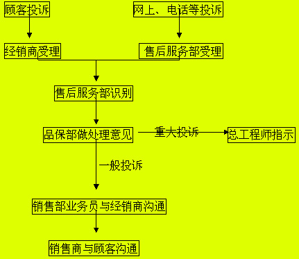 3.1銷售部和售后服務(wù)部負(fù)責(zé)顧客投訴的受理;負(fù)責(zé)將處理結(jié)果通過(guò)代理商(經(jīng)銷商)與顧客進(jìn)行溝通。